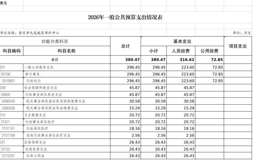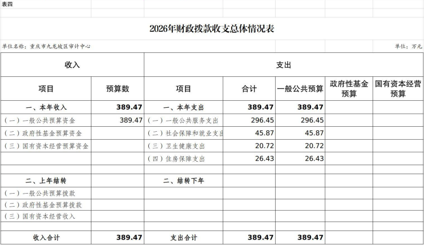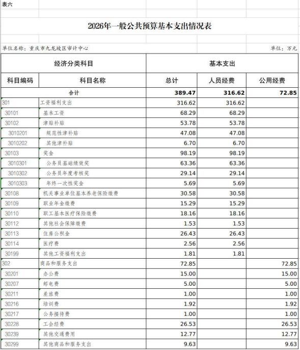 2026年一般公共预算财政拨款收入389.47万元,一般公共预算财政拨款支出389.47万元,比2025年减少30.48万元。其中:基本支出389.47万元,主要用于保障在职人员工资福利及社会保险缴费等,保障部门正常运转的各项商品服务支出,比2025年增加17.52万元,主要原因是人员晋级晋档,基本工资较上年有所增加;项目支出0万元,主要用于保障实施审计项目发生的办公费和聘请中介审计机构参与实施审计项目发生的委托业务费等重点工作,比2025年减少48万元,主要原因是九龙坡区审计局(本级)和九龙坡区审计中心合署办公,项目经费共同列支,本年度项目经费均编制在九龙坡区审计局(本级)。