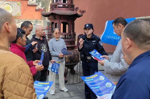 近日,九龙坡区公安分局黄桷坪派出所辖区内一寺庙开展“大年初五迎财神”祈福活动,派出所组织“九警防诈亲友团”成员借此契机开展反诈宣传。
