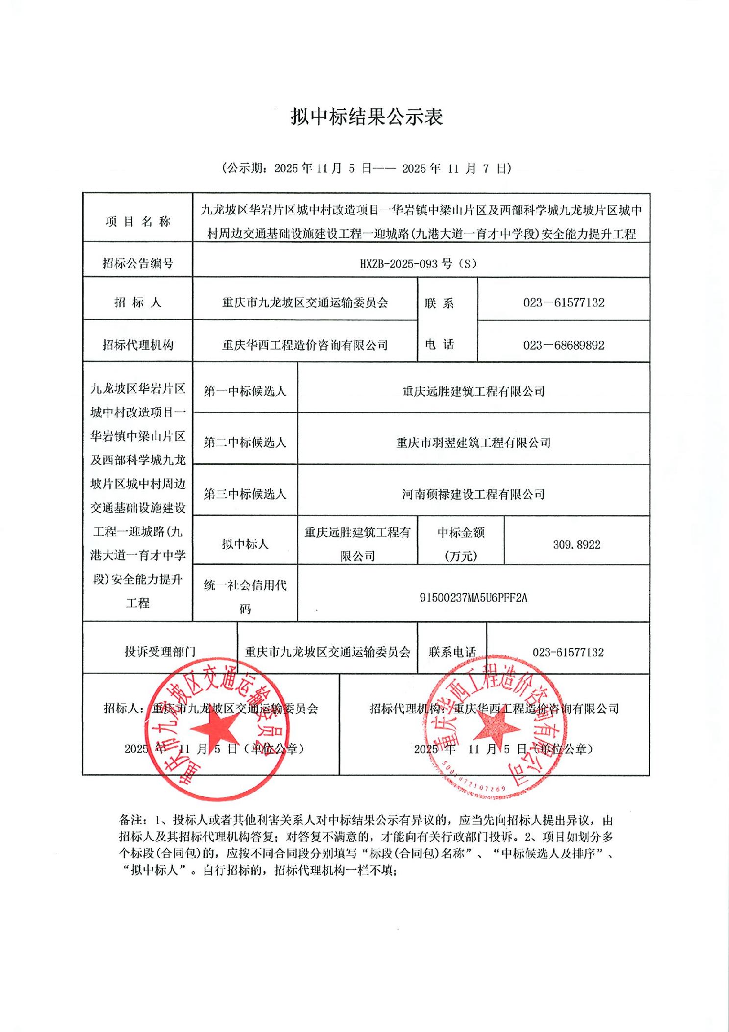 九龙坡区华岩片区城中村改造项目一华岩镇中梁山片区及西部科学城九龙坡片区城中村周边交通基础设施建设工程一迎城路(九港大道一育才中学段)安全能力提升工程拟中标结果公示
