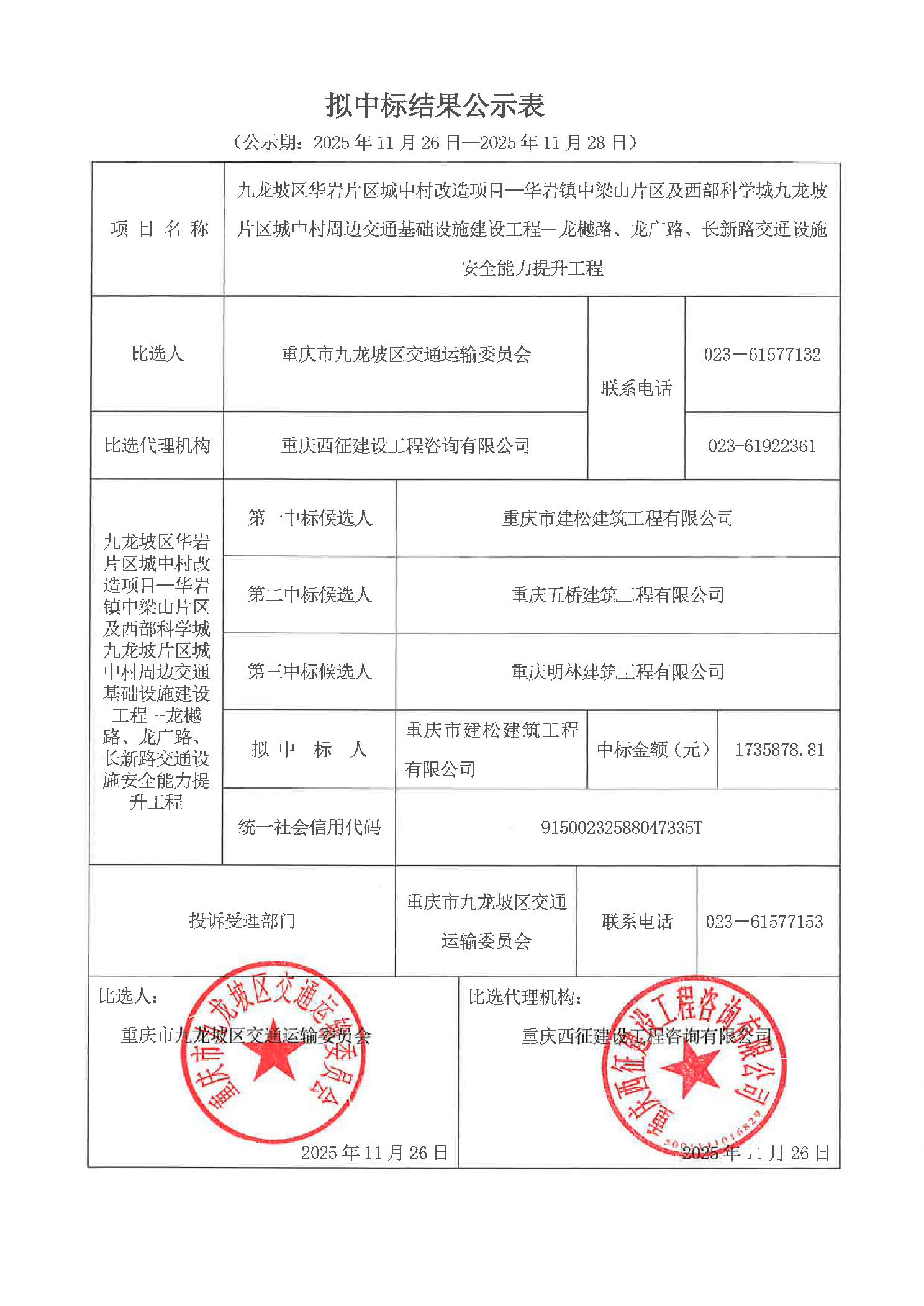 九龙坡区华岩片区城中村改造项目—华岩镇中梁山片区及西部科学城九龙坡片区城中村周边交通基础设施建设工程—龙樾路、龙广路、长新路交通设施安全能力提升工程拟中标结果公示