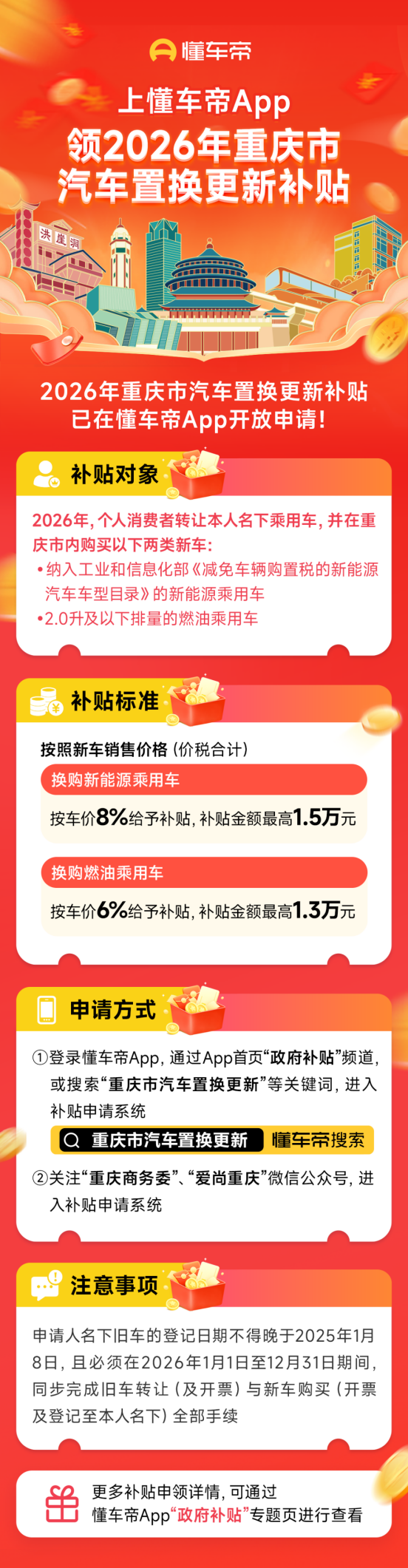 1月22日,2026年重庆市汽车置换更新补贴正式开放申请,第一批资金(按月投入)共1.85亿元。消费者换购符合条件的新能源乘用车或燃油乘用车新车,就能分别按照新车销售价格的8%、6%获得补贴。1月22日起,消费者可通过懂车帝App“政府补贴”频道,或关注“重庆商务委”“爱尚重庆”微信公众号进入补贴申请系统。