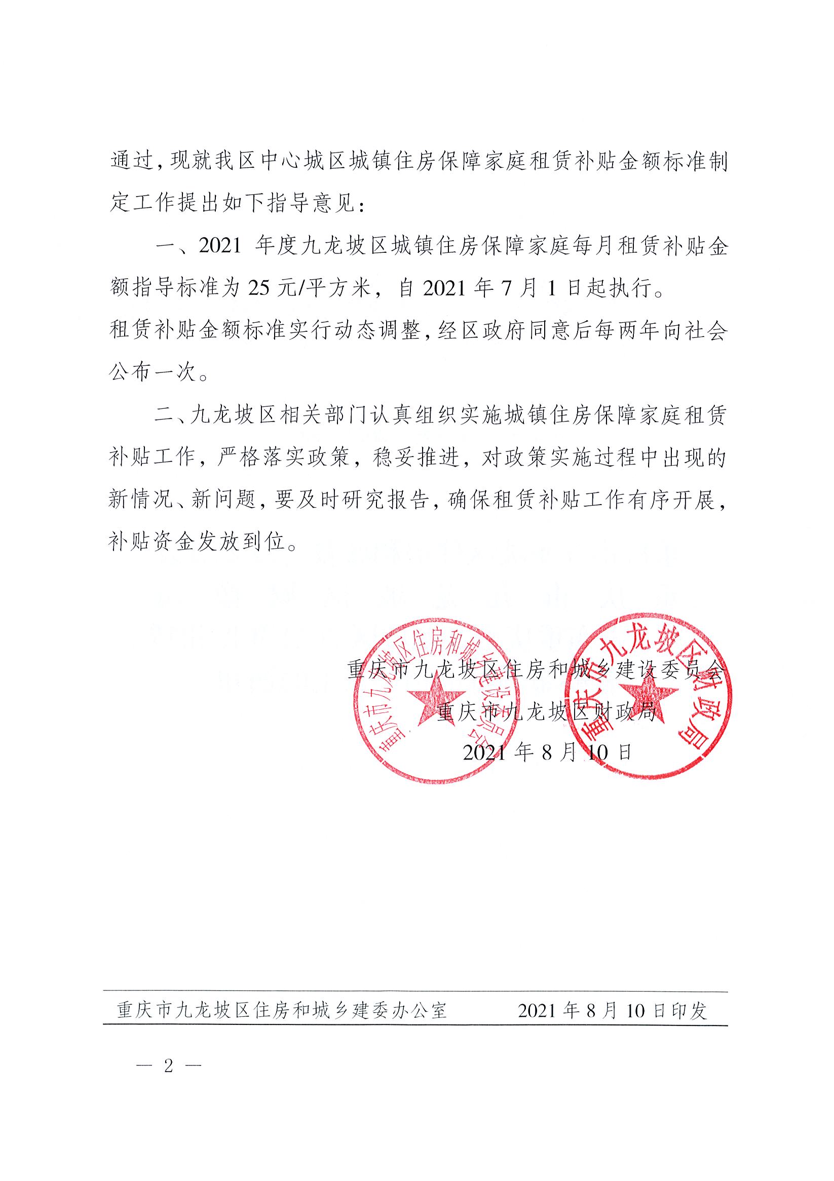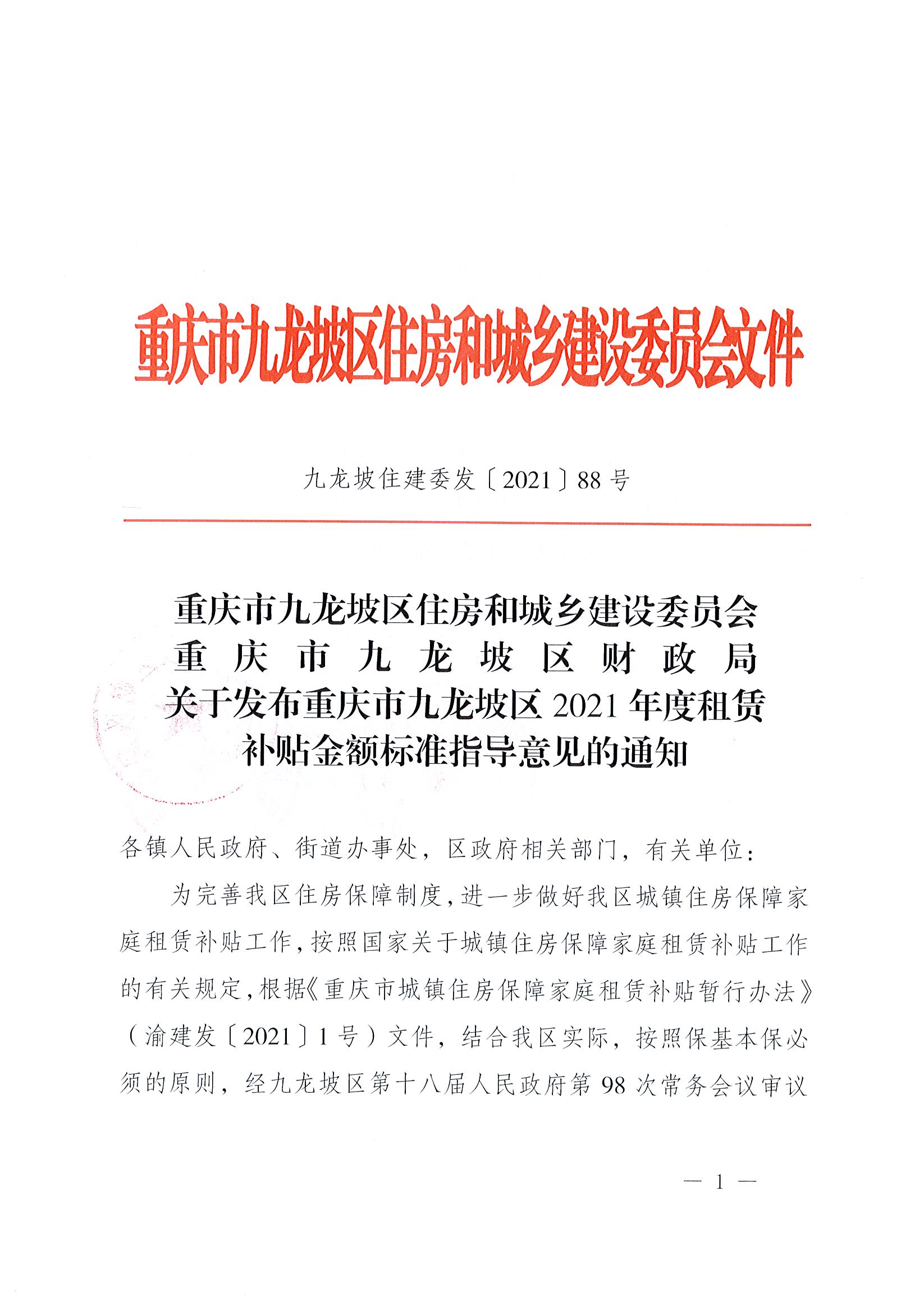关于发布重庆市九龙坡区2021年度租赁补贴金额标准指导意见的通知