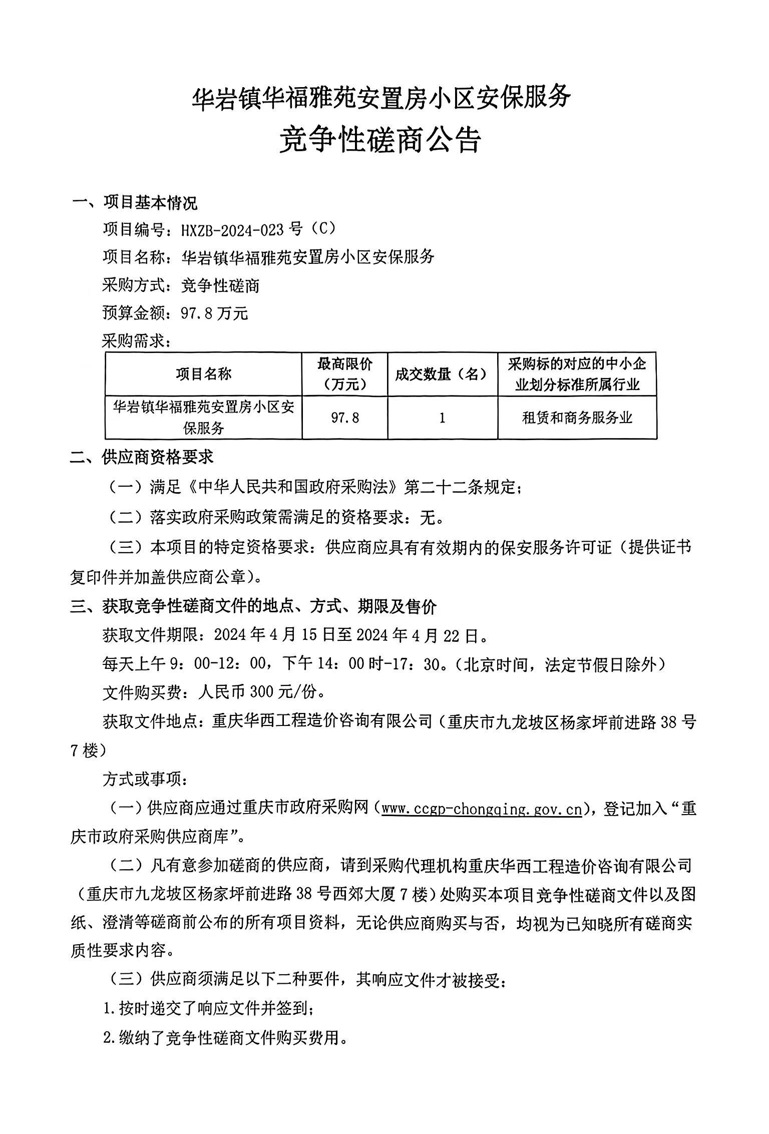 华岩镇华福雅苑安置房小区安保服务竞争性磋商公告