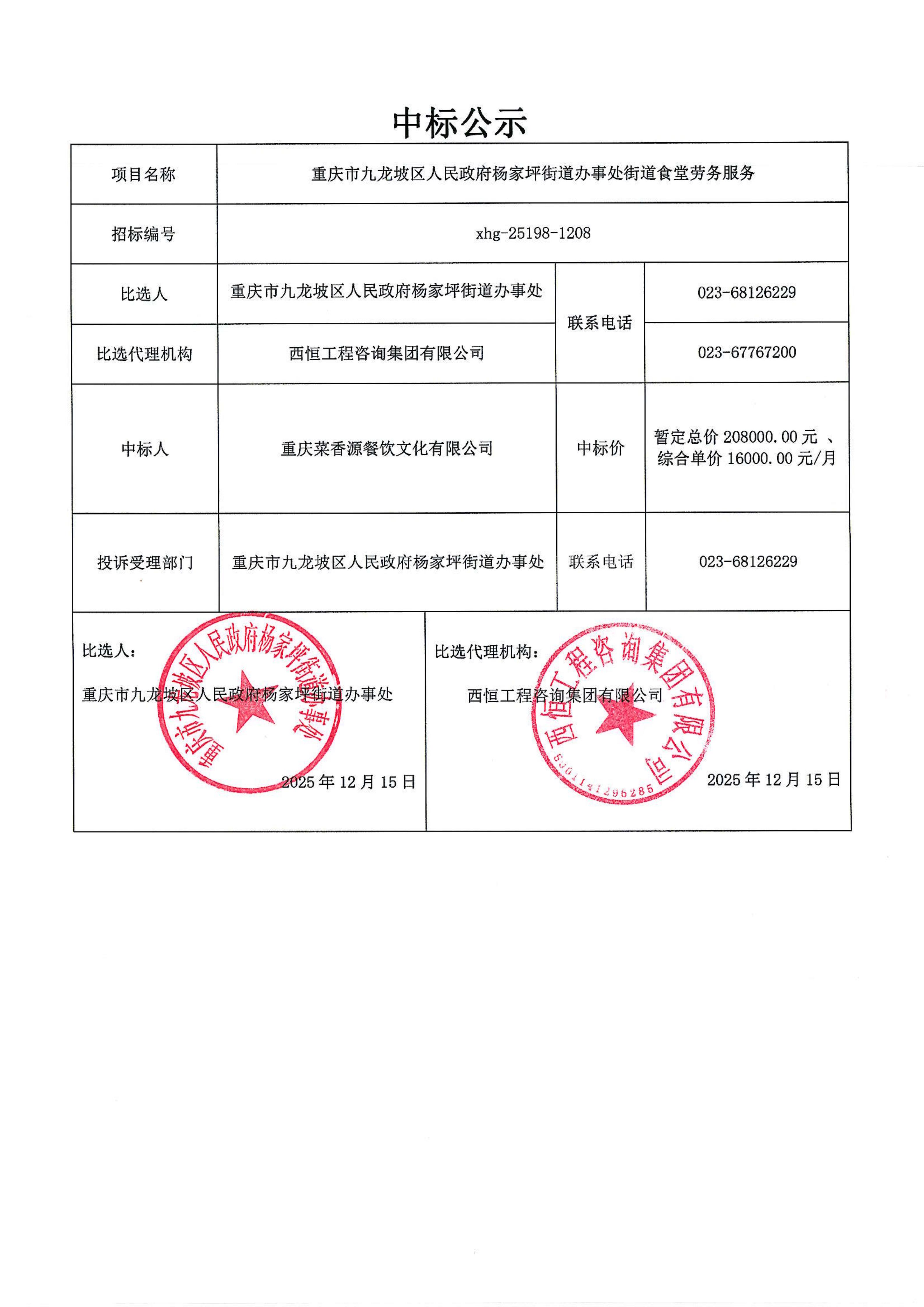 杨家坪街道食堂劳务服务竞争性比选结果公告