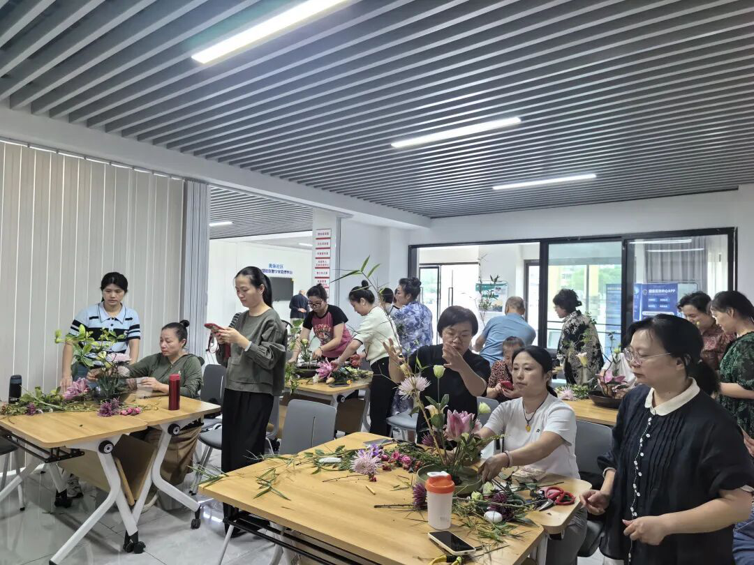 课堂上,专业花艺老师从花材识别、色彩搭配讲起,手把手示范修剪、插花等基础技巧。学员们专注聆听、悉心实践,原本零散的鲜花在手中逐渐变成错落有致的花艺作品。大家互相交流心得、分享创意,现场氛围热烈而温馨。此次公益课堂不仅让学员掌握了实用的花艺技能,更搭建了邻里互动的暖心平台。社区负责人李小维书记表示,后续将持续开展多元化文化活动,丰富居民精神生活。目前课程仍在进行中,花艺之美正为社区注入别样生机。
