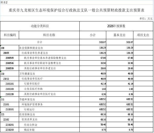 2.2026年重庆市九龙坡区生态环境保护综合行政执法支队一般公共预算财政拨款支出预算表