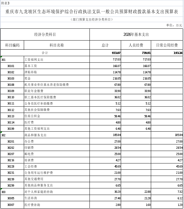 3.2026年重庆市九龙坡区生态环境保护综合行政执法支队一般公共预算财政拨款基本支出预算表