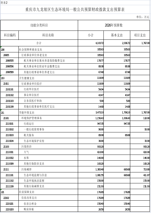 2.2026年重庆市九龙坡区生态环境局一般公共预算财政拨款支出预算表