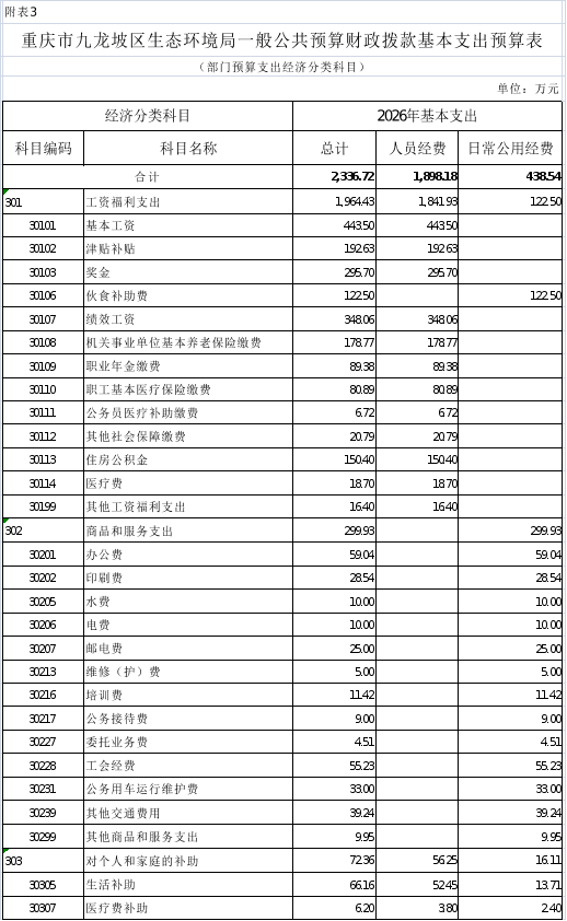 3.2026年重庆市九龙坡区生态环境局一般公共预算财政拨款基本支出预算表
