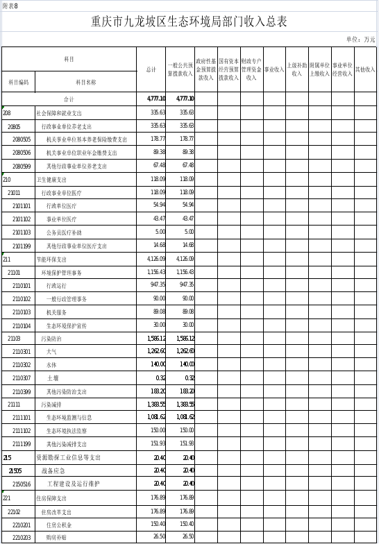 8.2026年重庆市九龙坡区生态环境局收入总表