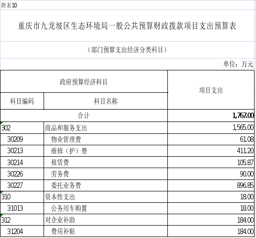 10.2026年重庆市九龙坡区生态环境局一般公共预算财政拨款项目支出预算表(部门经济分类科目)