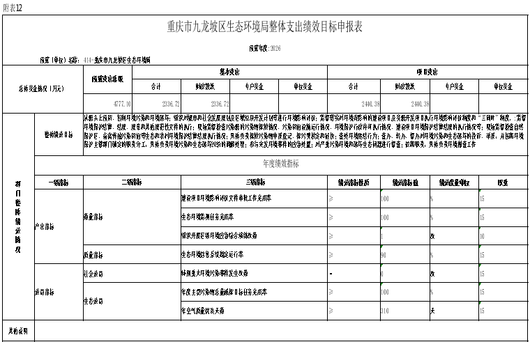 12.2026年重庆市九龙坡区生态环境局部门整体绩效目标表