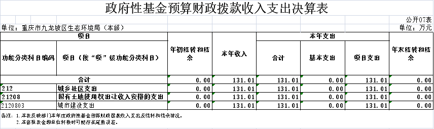 2024年度政府性基金预算财政拨款年初结转结余0.00万元,年末结转结余0.00万元。本年收入131.01万元,较上年决算数减少1738.27万元,下降92.99%,主要原因是项目土壤监测能力建设、一江三河水质在线监测、九龙坡区生态环境大数据平台二期建设等已完成。本年支出131.01万元,较上年决算数减少1738.27万元,下降92.99%,主要原因项目土壤监测能力建设、一江三河水质在线监测、九龙坡区生态环境大数据平台二期建设等已完成。