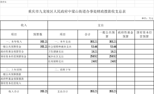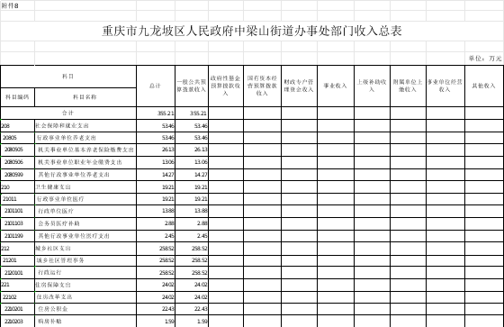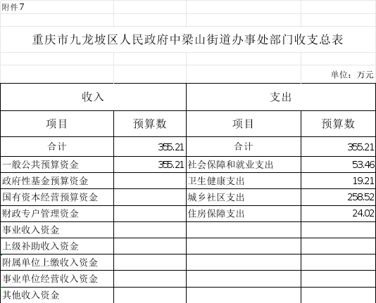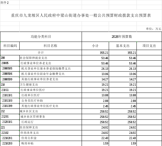 2026年一般公共预算财政拨款收入355.21万元,一般公共预算财政拨款支出355.21万元,比2025年增加77.16万元。其中:基本支出355.21万元,比2025年增加77.16万元,主要原因是人员待遇变动导致人员经费变动。主要用于保障管理重庆市九龙坡区城市管理综合行政执法支队中梁山街道大队在职人员工资福利及社会保险缴费,离休人员离休费,退休人员补助等,保障单位正常运转的各项商品服务支出;项目支出0万元,比2025年增加0万元。