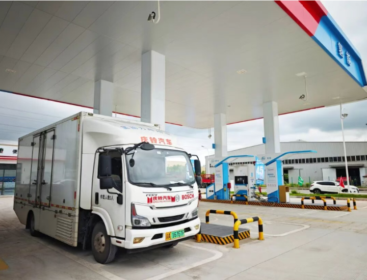 ▲博世庆铃氢动力车、渝鸿创能氢动力车正在加氢