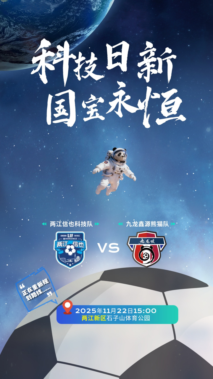 九龙融媒讯(记者 范坤民)11月22日(周六),2025年“新韵重庆渝超同行”重庆城市足球超级联赛将迎来一场备受瞩目的同城对决。九龙鑫源熊猫队将以客场身份出征石子山体育公园足球场,与两江信也科技队正面交锋,为球迷们献上一场满含竞技魅力与拼搏激情的足球盛宴。