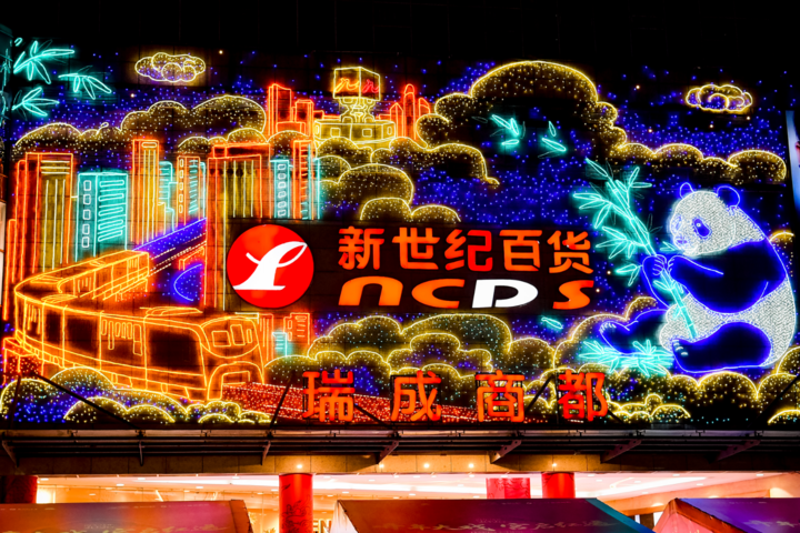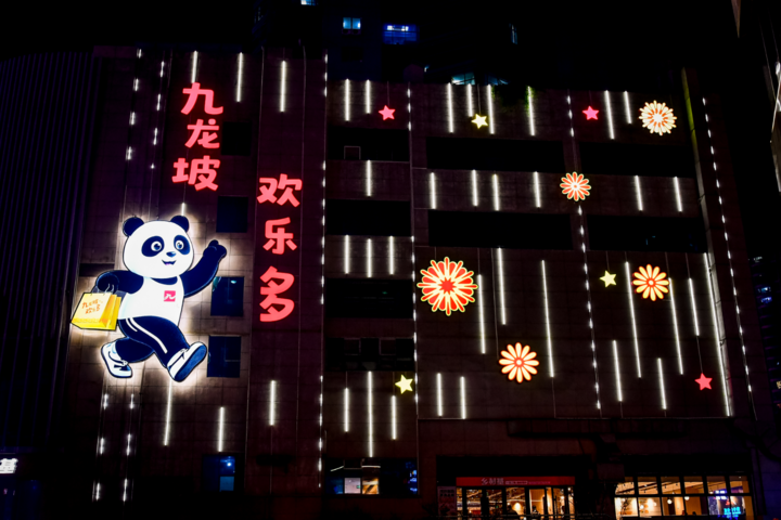 ▲杨家坪步行街,熊猫主题灯饰与“九龙坡 欢乐多”字样的灯组扮靓街头。