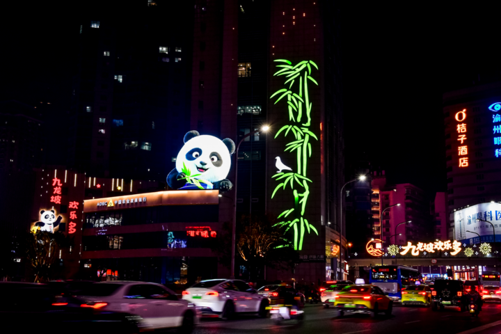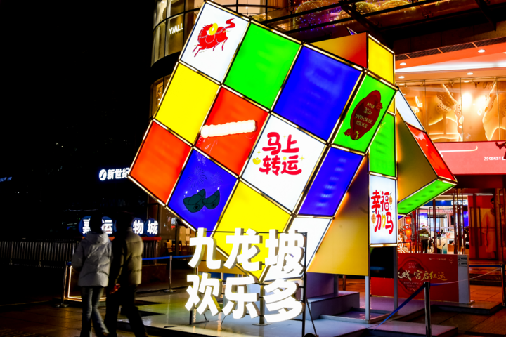 漫步杨家坪步行街,仿佛步入一片熊猫主题的梦幻乐园。手提购物袋的熊猫灯饰灵动鲜活,与“九龙坡欢乐多”的发光字相映成趣;一旁高达数米的“熊猫吃竹”灯组,搭配节节高升的竹子造型,寓意新年事业生活“步步高”。商场门口,轨道列车穿梭于祥云灯影之间,一只呆萌熊猫倚靠车旁悠然吃竹,七彩斑斓的“马年魔方”矗立街角,转动着“马上财运旺”“马上转运”等祝福语,为即将到来的马年增添喜庆与期许。