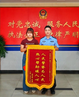 近日,辖区居民蒋女士将一面印有"人民警察为人民,热心帮助暖人心"的锦旗送至九龙坡区公安分局华岩派出所,感谢民警及时预警劝阻,助其家人识破骗局。