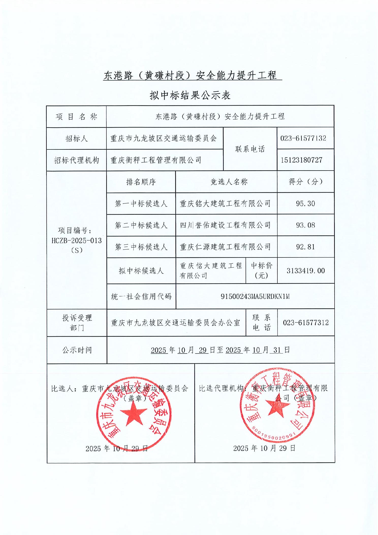 东港路(黄磏村段)安全能力提升工程拟中选结果公示
