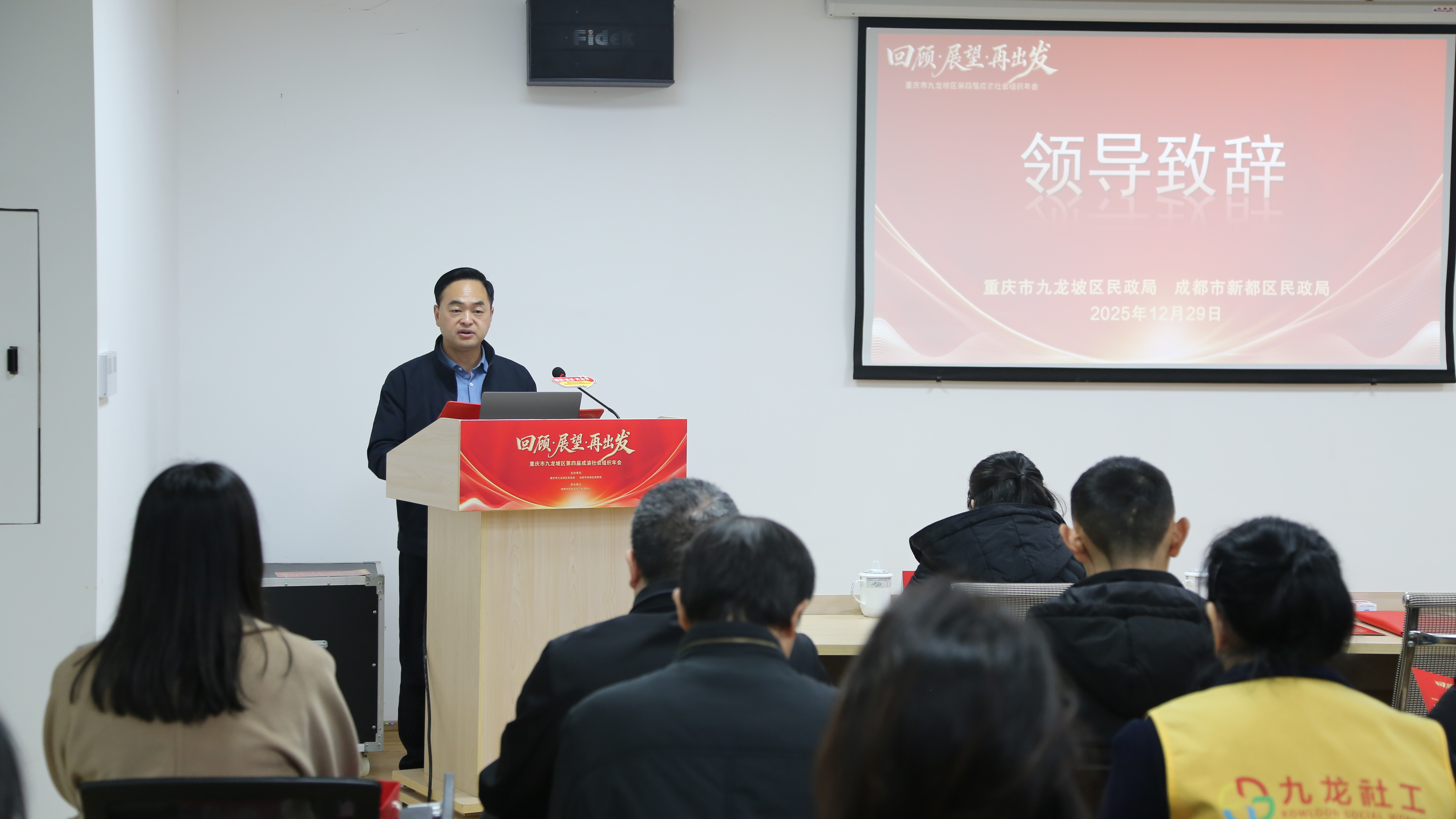 九龙坡区民政局党组书记、局长胡志致开幕词并分享九龙坡区社会组织“十四五”发展回顾与“十五五”期间展望。他指出,当前成渝地区双城经济圈建设进入纵深推进关键阶段,为两地社会组织跨区域协作提供了广阔舞台。“十四五”期间,九龙坡区在全市率先构建社会组织|“1+N”服务体系,通过“三个抓牢”、“三个一批”、“三个服务”、“三个加强”,切实推动社会组织高质量发展。他强调,“十五五”时期,要以此次年会为纽带,健全两地协作机制,推动社会组织优势互补、协同发力,引导社会组织在服务现代化新重庆建设、助力成渝地区双城经济圈建设中主动担当作为。