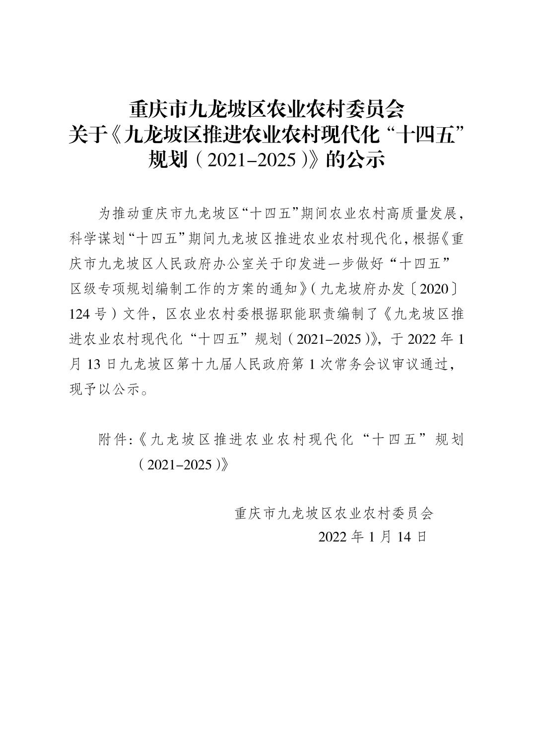 重庆市九龙坡区农业农村委员会关于《九龙坡区推进农业农村现代化“十四五”规划(2021-2025)》的公示