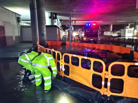 二郎环卫基地,我委应急抢险人员用挡水板、沙袋、围栏将积水引流,打开井盖、水篦子加速排水