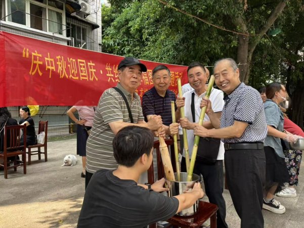 民俗活动“打糍粑”将氛围推向高潮。军休干部轮流上阵,手持木槌、竹竿,有节奏地捶打糯米,铿锵有力的捶打声与欢声笑语交织在活动现场。糍粑制作完成后,裹上豆面的糍粑软糯香甜,军休干部们一边分享美味,一边畅谈家常,交流中秋习俗,在协作中重温传统制作乐趣,增进彼此情感交流。