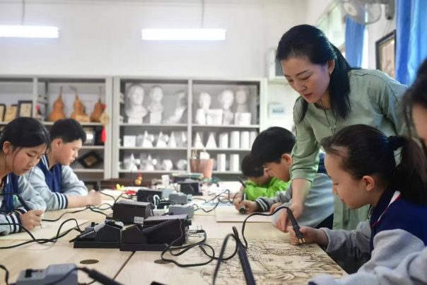 无独有偶,在铁路中学,烙画成为了学校重点开发的特色课,不仅编印了烙画校本教材,还通过墙面、楼道、教室等空间,校园广播、网站等宣传平台大力推广烙画知识。如今,烙画实践课成为了铁路中学发展的新亮点。