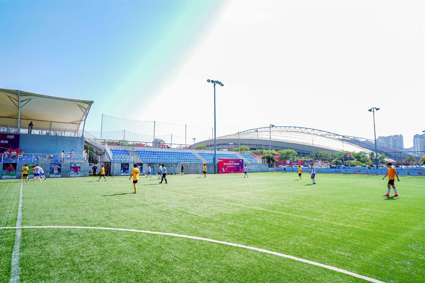 开赛当日,阳光明媚,奥体绿茵场热度不减。球员们全力投入,抢断、传球、射门、扑救等动作连贯流畅,团队配合默契十足;场边战术指导、助威呐喊声不断,“全民健身渝你同乐”标语与足球熊猫形象相映成趣,尽显以球会友、乐享运动的氛围。