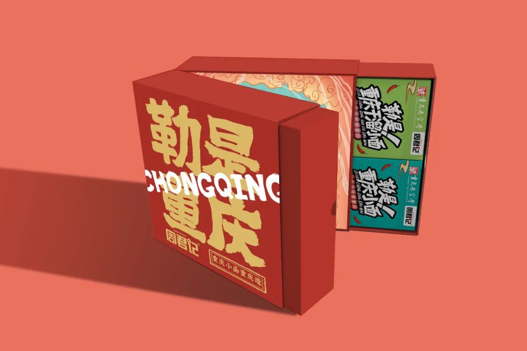 在周君记小面礼盒的设计中,由于代表重庆小面,于是周君记取名“面面俱到”和“勒是重庆”作为礼盒创意品名,包装盒上的字体采用书法手写字体更显大气,内页方面周君记将整套产品的元素融合在一起做成插画形式, 画面饱满丰富,整个礼盒包装,高端品质,时尚有冲击力。