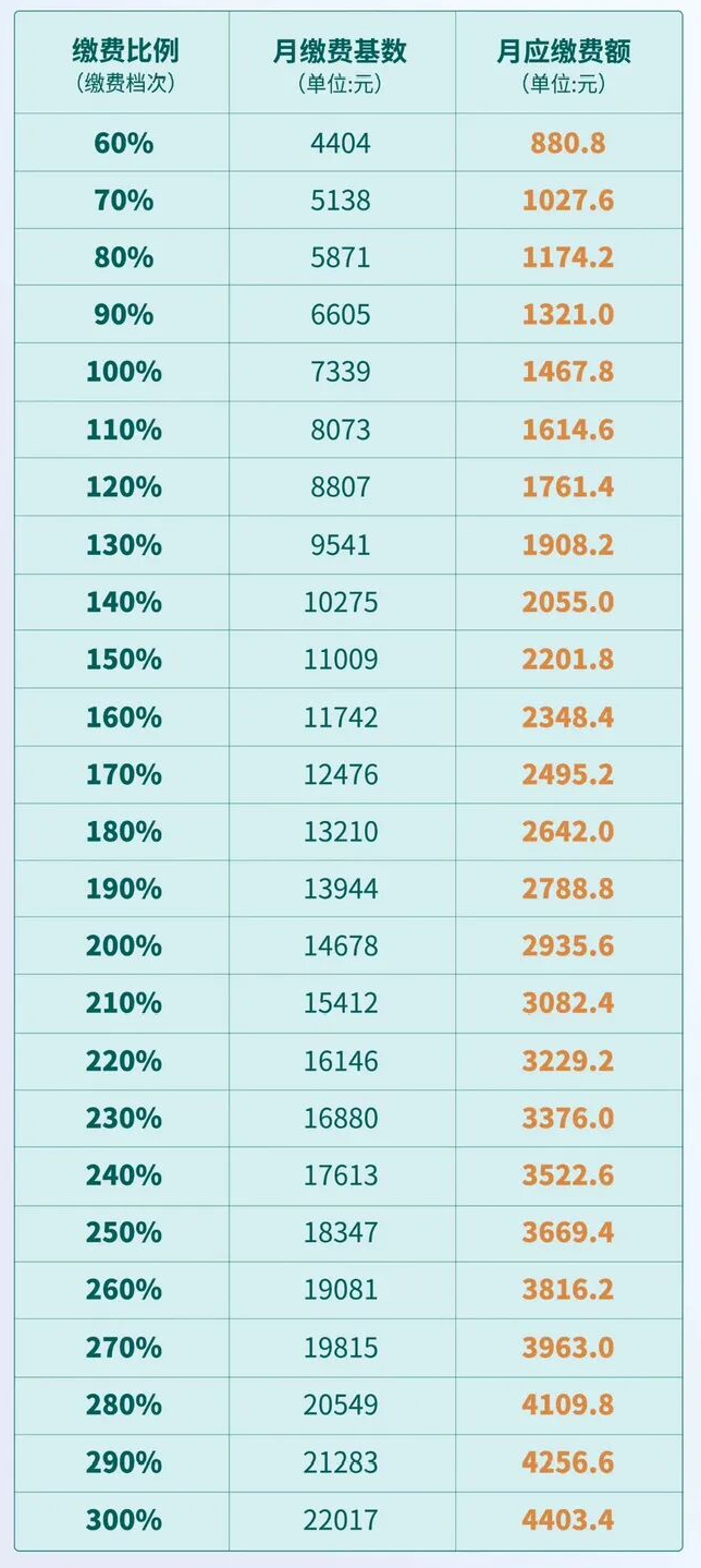 目前,缴费基数上下限核定中使用的就业人员平均工资暂执行2024年全市就业人员平均工资标准,即88065元/年,待2025年全市就业人员平均工资出台后,再按新标准补收差额。按照不同的月缴费基数,月缴费金额具体如下: