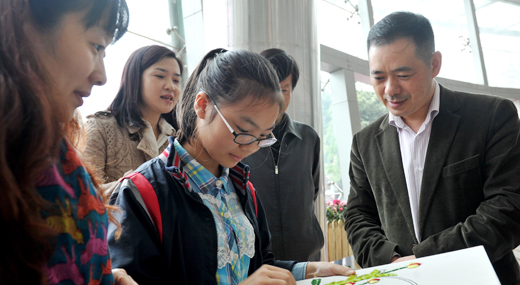 10月14日,第六届我区青少年科技创新区长奖颁奖仪式,在实验天宝学校举行,区长刘小强参观获奖作品麻棉画。(记者周邦静 摄)